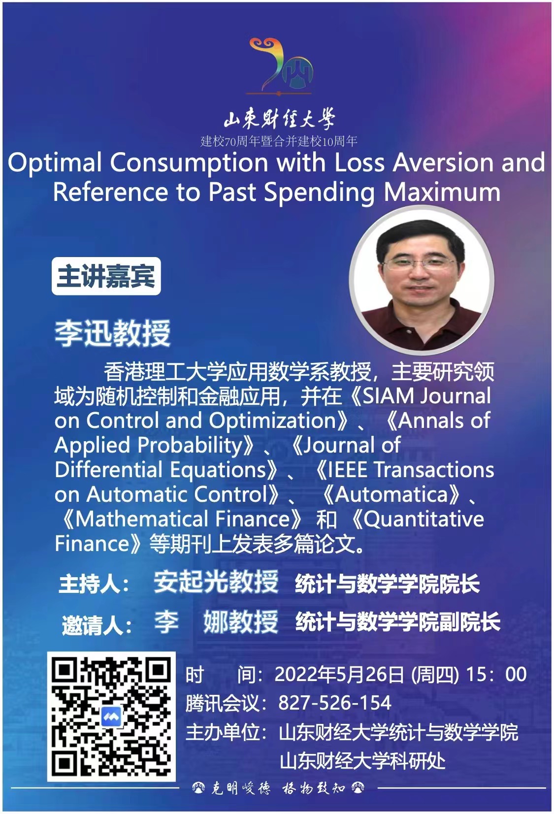 李迅教授于1992年在上海科技大学数学系获得学士学位、1995年在上海大学数学系获得硕士学位、2000年在香港中文大学系统工程与工程管理系获得博士学位,并在该系担任博士后研究人员至2001年;2001年至2003年,在卡尔加里大学的数学与计算金融实验室担任博士后研究员;2003年至2007年,在新加坡国立大学数学系担任访问学者。李迅教授于2007年加入香港理工大学应用数学系并担任助理教授,2013年担任副教授,现任教授,主要研究领域为随机控制和金融应用,并在《SIAM Journal on Control and Optimization》、《Annals of Applied Probability》、《Journal of Differential Equations》、《IEEE Transactions on Automatic Control》、《Automatica》、《Mathematical Finance》和《Quantitative Finance》等期刊上发表多篇论文。