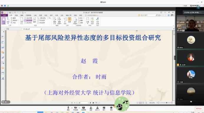 第二位报告人是上海对外经贸大学赵霞教授。赵霞教授是理学博士,应用经济学博士后,北卡罗来纳大学和滑铁卢大学访问学者,曾担任山东财经大学统计学院副院长、博士生导师。研究方向为风险管理与精算、金融统计。主持国家自然科学基金面上项目2项、教育部人文社科项目2项,在国内外重要学术期刊发表学术论文40余篇,5项研究成果曾获得省部级奖励。赵教授报告的题目是《基于尾部风险差异性态度的多目标投资组合优化》,报告对峰度系数进行调整用以刻画资产收益率左尾的厚度,并以此为聚类特征,运用K-Means方法把资产划分为若干个资产组。在此基础上,考虑投资者对于不同类别资产组的尾部极端风险所持有的不同态度,利用逐步优化的思想提出了两类均值-方差-多置信水平CVaR优化模型,并进行模拟和实证分析。从尾部风险态度、优化模型、目标收益率、投资者风险偏好等多角度对比分析,研究对最优策略的影响。研究表明:在达到相同目标收益的条件下,新的模型通过减小总的投资比例,减小了投资组合的风险暴露,且能够更好的控制风险,投资策略具有更稳定的外样本表现。