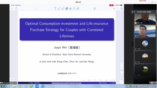 首先作报告的是华东师范大学紫江青年研究员、博士生导师危佳钦教授。危佳钦教授2012年获华东师范大学博士学位,2012年8月至2015年12月任澳大利亚麦考瑞大学博士后研究员。研究方向为精算学、金融数学、随机控制等,主持国家自然科学基金项目2项,发表学术论文30余篇,获2019年上海市自然科学奖三等奖。他的报告题目是《Optimal consumption–investment and life-insurance purchase strategy for couples with correlated lifetimes》。危教授在报告中提出了一种使基于家庭目标最大化的家庭消费、投资和人寿保险购买策略优化方法。他利用copula模型和公共冲击模型对两个工薪阶层的假设相关寿命进行了建模。然后,在copula模型和一个特殊情况下,得到了确定最优策略的闭式解。copula模型的使用在提供封闭式策略和区分死亡率影响的能力方面更为有利。他对所考虑的优化问题在马尔可夫环境下进行了研究,并用Hamilton–Jacobi–Bellman方程求解,用数值算例说明了该优化策略的实用价值和可行性。