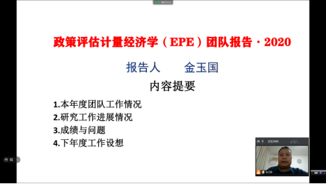 年会第一个阶段,EPE团队负责人金玉国教授做了2020年度团队工作汇报,总结了本年度的团队工作,介绍了有关研究工作的进展情况,分析了成绩和不足,提出了下一年度活动的初步设想。