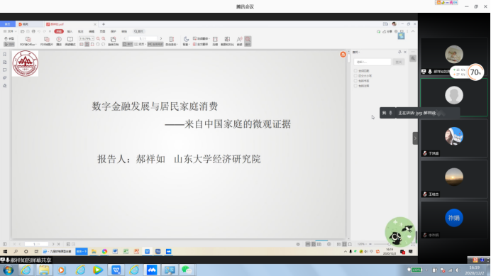 最后一个报告者是来自山东大学经济研究院的郝祥如博士,她报告的题目是《数字金融发展与居民家庭消费——来自中国家庭的微观证据》。她认为,由于传统金融服务的供给短缺、监管环境的相对包容以及信息技术的快速发展,中国数字金融以其独有的创新优势为金融市场带来了一系列变革。其中一项重要应用便是为消费者提供普惠性金融服务。在核心概念界定和理论分析基础上,构建实证计量模型,利用北大数字普惠金融指数和西南财大中国家庭金融调查(CHFS)数据,研究了数字金融发展对我国居民家庭总消费的影响,并且实证检验了影响机制。实证结果表明,数字金融总指数能显著提高城乡居民家庭消费支出,且对农村居民家庭消费的影响作用更大,同时数字金融覆盖广度和数字化程度对农村居民家庭消费影响更大,数字金融使用深度对城镇居民家庭消费影响作用更大。进一步对上述差异存在原因的研究发现,数字金融发展对城乡居民家庭消费的影响机制存在差异:第一,数字金融能够提高城镇居民收入来促进居民家庭消费,对农村居民家庭的影响不显著;第二,在城镇家庭和农村家庭中,数字金融均能通过降低家庭面临的不确定性来促进家庭消费,对城镇居民影响作用更大;第三,数字金融能通过便利支付和缓解流动性约束来促进农村居民家庭消费,对城镇居民家庭的影响不显著。