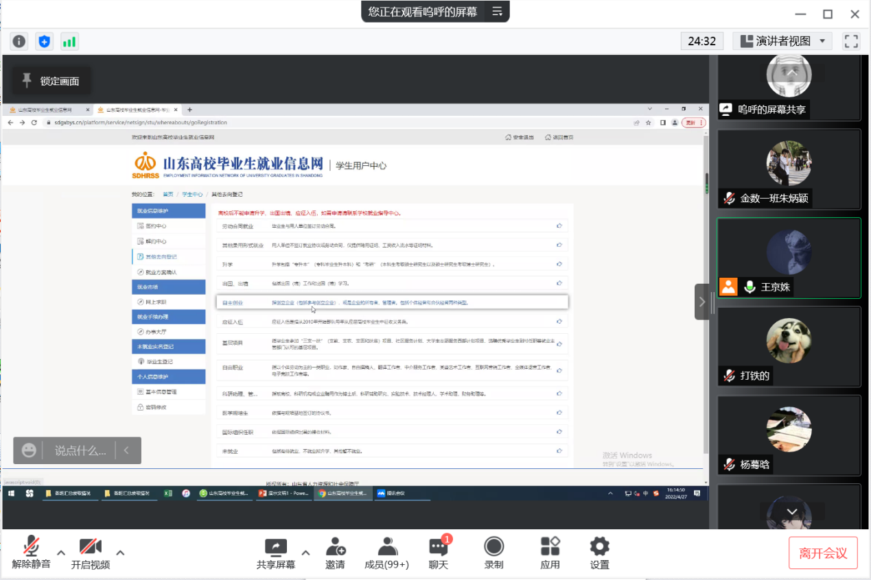 4月27日下午,2018级毕业生就业交流促进会在线上召开。我院毕业班辅导员王京姝、就业办主任燕文静及2018级金融数学、数学与应用数学专业全体同学参加会议。会议开始前,学院通过多种方式,对毕业生目前面临的主要问题和思想动态做了调研,力图通过本次会议有针对性地解决就业实际问题,推动高质量就业。