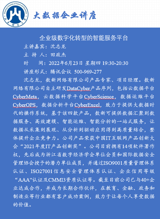 沈志龙,数新网络有限公司产品专家、项目经理。数新网络有限公司自主研发DataCyber产品序列,包括云数据平台CyberMeta,云数据科学平台CyberScience,数据运维平台CyberOPS,数据分析平台CyberExcel,致力于提供大数据时代的操作系统,基于该四款产品,数新可提供数据汇聚到数据服务、高效建模、智能运维、智能分析的一站式服务,让数据从采集到展现、从分析到驱动应用得到高质量结合,整体提升企业竞争力。公司产品荣获中国IT互联网产品创新大会“2021年度IT产品创新奖”。公司目前拥有14项软件著作权,先后成为浙江省数字经济学会单位会员和国际数据安全管理协会授予的潜力单位成员,并通过ISO9001质量管理体系认证、ISO27001信息安全管理体系认证、企业信用等级“AAA”认证及CMMI3资质认证等。截至目前公司已与40+企业达成合作,并成为长期合作伙伴,在教育、金融、政务和制造业等行业都有客户成功案例,致力于让每个人享受数据的价值。(审核:李玉成)