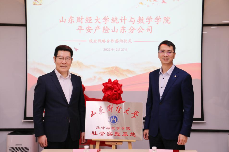 12月27日上午10点,山东财经大学统计与数学学院与中国平安财产保险股份有限公司山东分公司战略合作框架协议书签署仪式在平安产险山东分公司隆重举行。平安产险山东分公司党委委员、副总经理陈东永、人事行政部经理丁莉、人事行政部组织支持室主任侯振宇、人事行政部招聘运营岗负责人周琦,山东财经大学统计与数学学院党委书记李玉成、党委副书记杨德嵋、孙栋梁、团委书记张秀萍、学工办主任王京姝、辅导员姚宝奎出席。仪式由丁莉主持。