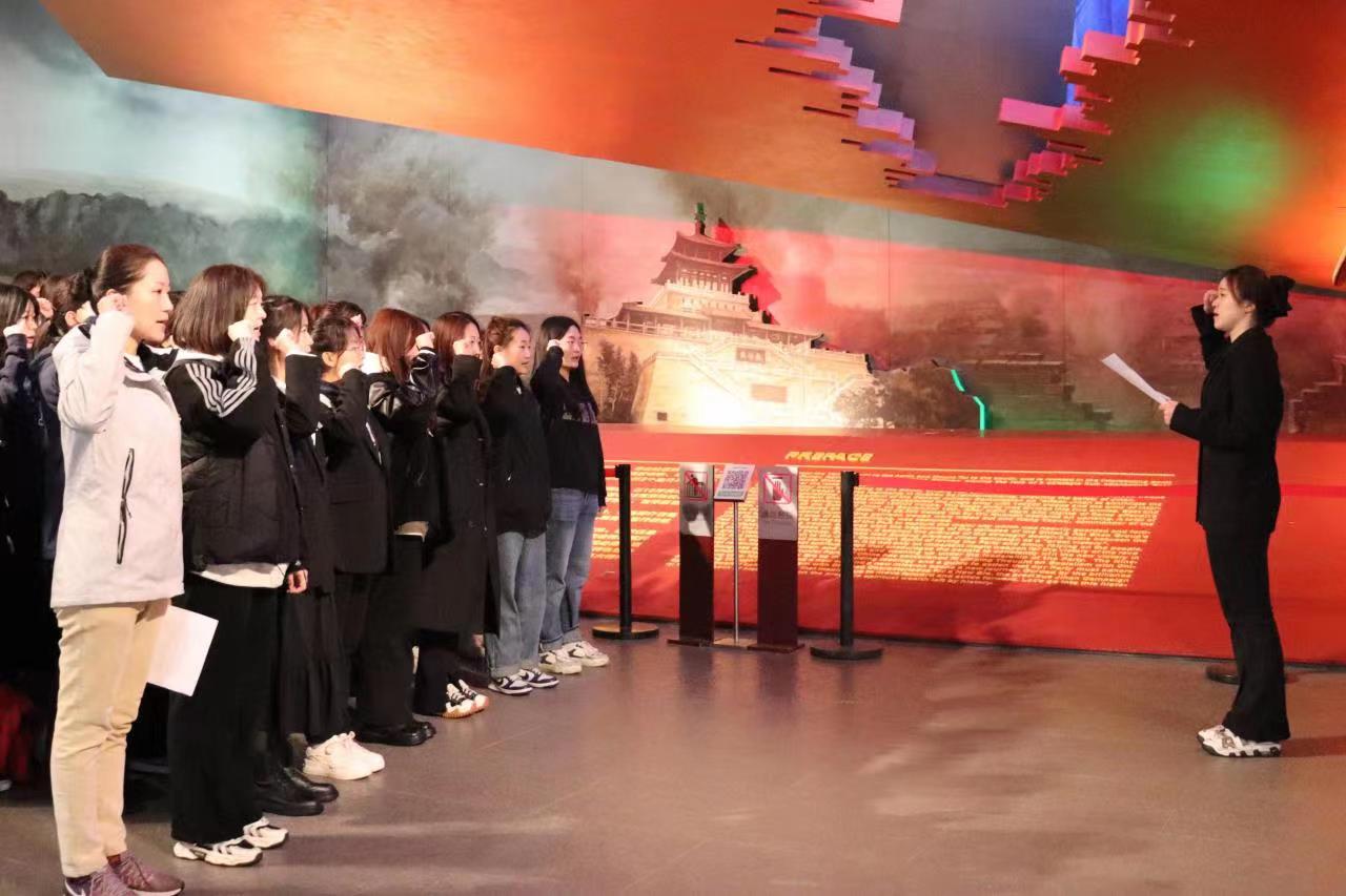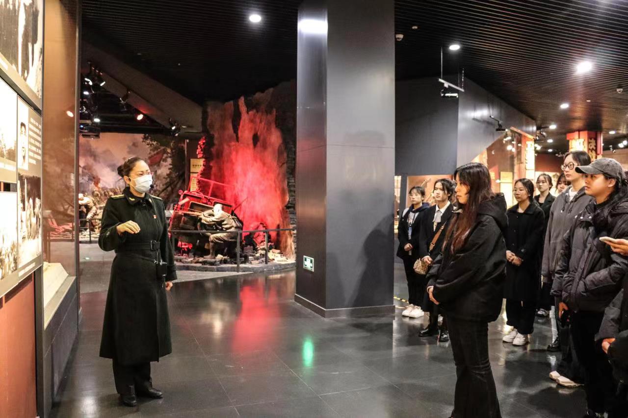 全体师生参观济南战役纪念馆,并在此进行庄严宣誓。学生代表刘靓彬发言,强烈表达出对革命先烈的深切缅怀和崇高敬意,呼吁着我辈青年于新时代之下铭记先烈、勇毅笃行。在讲解员的带领之下,我们回顾了从“和战博弈,生死较量”到“八天八夜,鏖战古城”再到今日的“新时代,新泉城”,一张张泛黄的照片,一件件烈士的遗物让大家驻足凝视。雄伟壮阔的纪念馆是先烈们浴血奋战的见证,更是中华民族“英勇顽强,敢于胜利”精神的体现。来到毛泽东主席亲笔题名的“革命烈士纪念塔”下,学子们在低头默哀后,将手中的白色菊花一一摆放在纪念碑塔下以告慰英雄先烈。