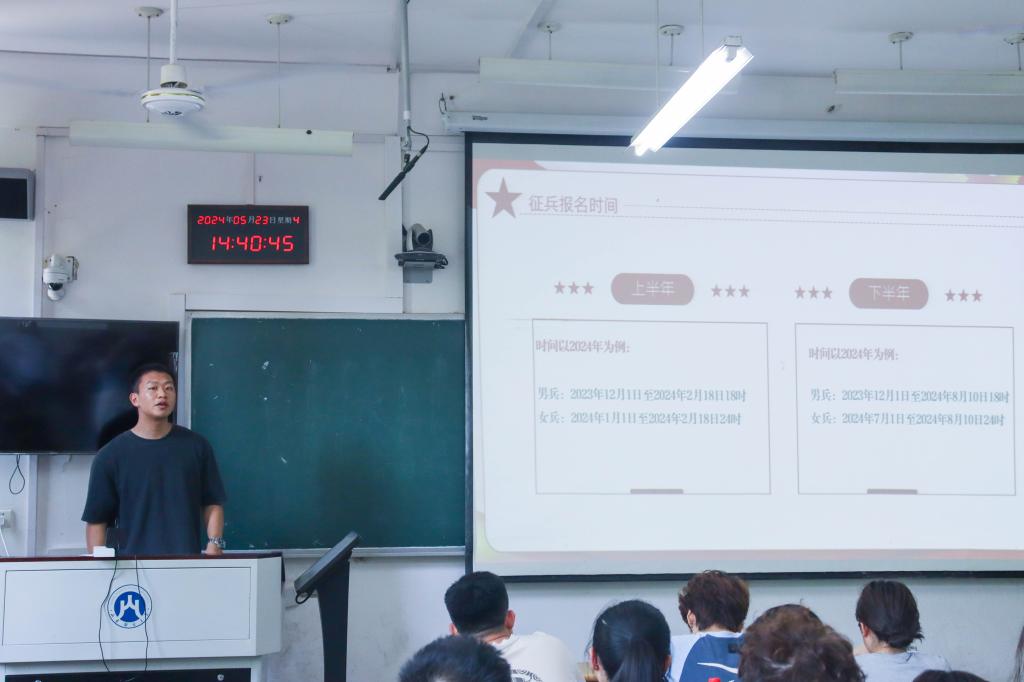 5月23日,学校党委学生工作部、武装部和统数学院联合举办了“有志青年,报国参军”征兵政策毕业生专题宣讲会。本次宣讲会在舜耕校区2号教学楼举行,由关扬、方孜鑫主讲,我院燕山校区、舜耕校区100余名毕业生参加本次宣讲。