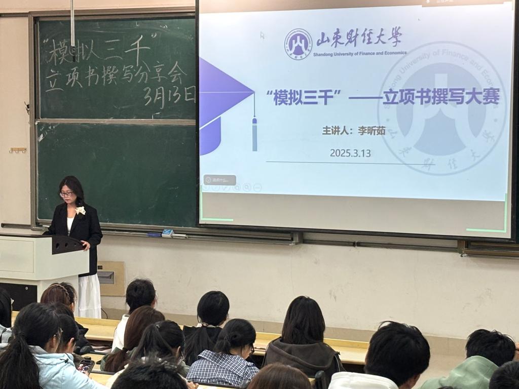 3月13日,统计与数学学院在章丘校区举办了“模拟三千”——立项书撰写分享会。校社会实践中心副部长、院学生会科创竞赛部副部长相昕杉和大学生青年发展与实创中心实践工作处副部长李昕茹担任主讲人。2024级学生积极参加分享会。