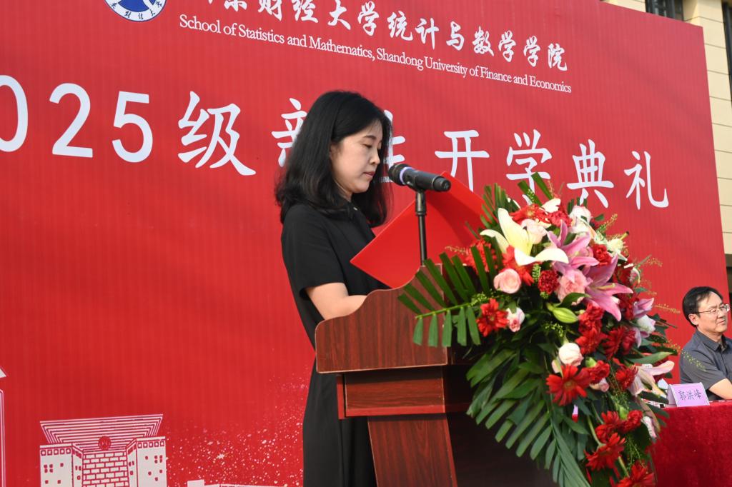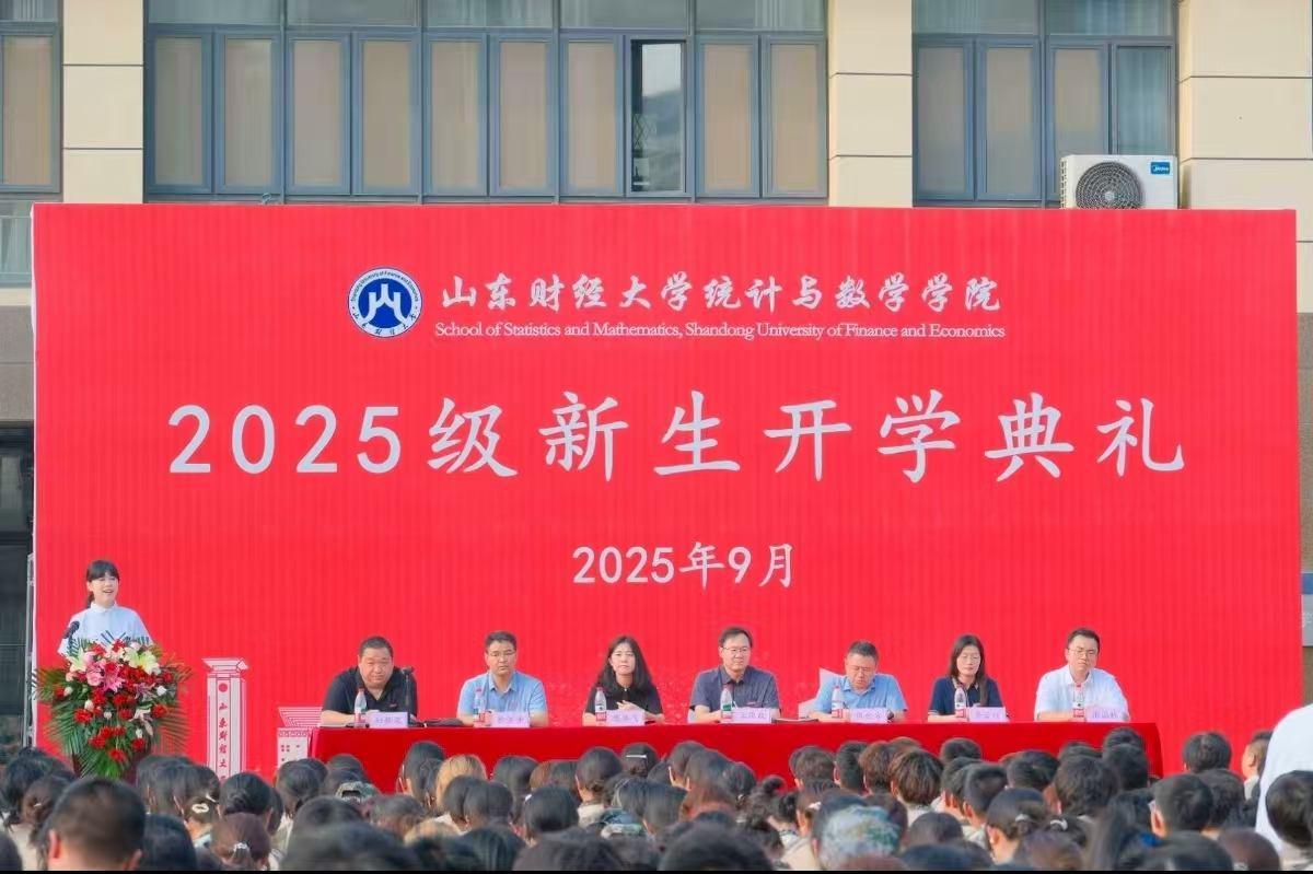 9月13日下午,统计与数学学院2025级新生开学典礼在章丘校区举行。校党委委员、副校长王敬政,学院院长田金方,党委副书记孙栋梁、李云枝,副院长郭洪峰,校友代表、北京航空航天大学康雁飞教授等出席典礼。典礼由孙栋梁主持。