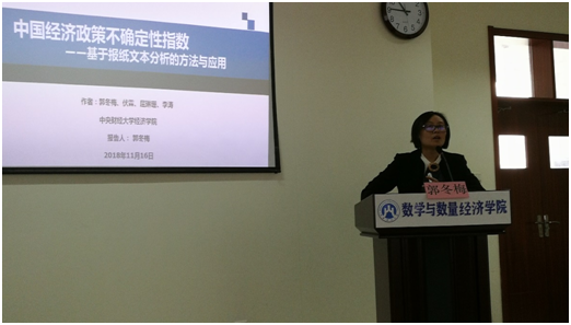 11月16日上午,中央财经大学博士生导师郭冬梅教授应学院和金融数学团队共同邀请来我院作题为“中国经济政策不确定性指数”的学术报告。金融数学系主任张慧教授,金融数学系书记郭洪峰教授,金融数学团队负责人朱庆峰副教授以及学院部分教师和研究生、本科生到会聆听了报告。报告会由院长安起光教授主持。