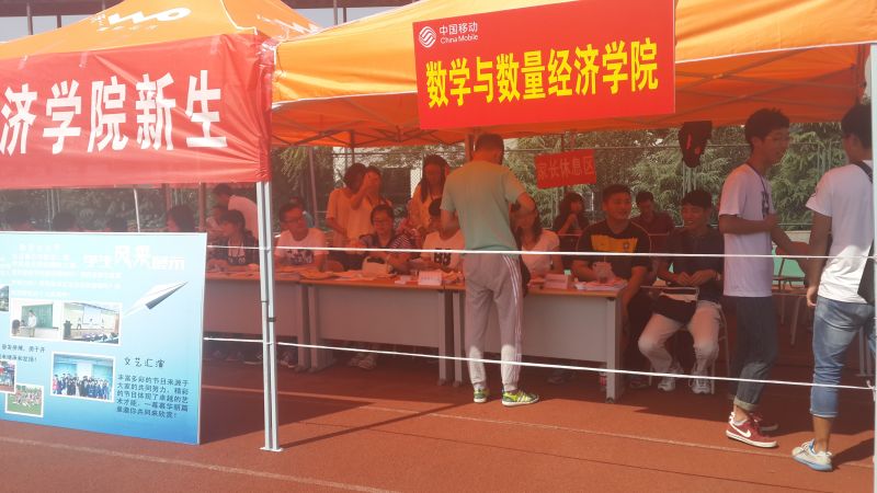 2015年9月7日,新学期开始,数学与数量经济学院又迎来了一批青春激昂的莘莘学子,他们带着对大学生活的憧憬,加入了我院这个大家庭。为做好迎新工作,我院大二的同学们组成了一支满怀热情的志愿者团队,在圣井校区操场圆满完成了为期两天的2015级新生迎接工作。
