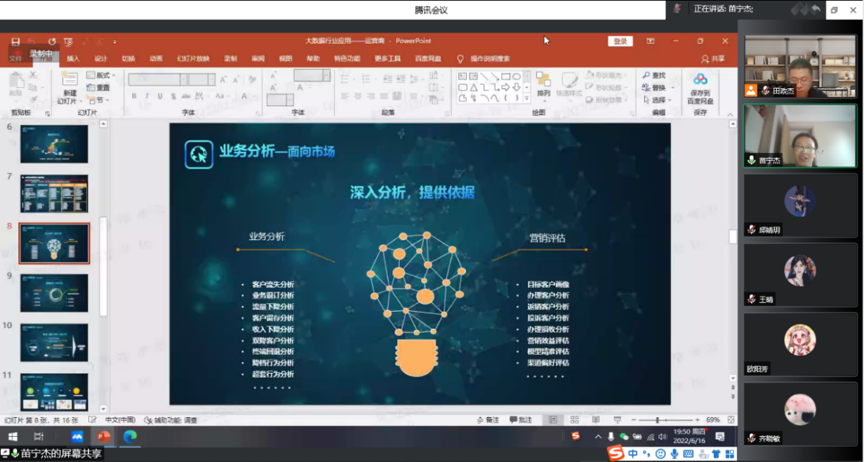 本次讲座中,苗宁杰经理基于自身工作介绍了运营商在营销中使用的思路和方法,从行业应用、业务分析和对外合作三个方面展开讨论。行业应用主要介绍了运营商如何利用数据展开分析的问题,业务分析讨论了运营商的营销案例及赢利点分析,对外合作涉及运营商对外端口的开放、数据共享等问题。在讲座中,苗宁杰经理基于自身的成长经历强调了统计方法、数据与业务相结合的重要性。讲座结束后,苗宁杰经理与在场的老师、同学展开了深入讨论,鼓励同学们积极转变心态,积极学习,快速成长。