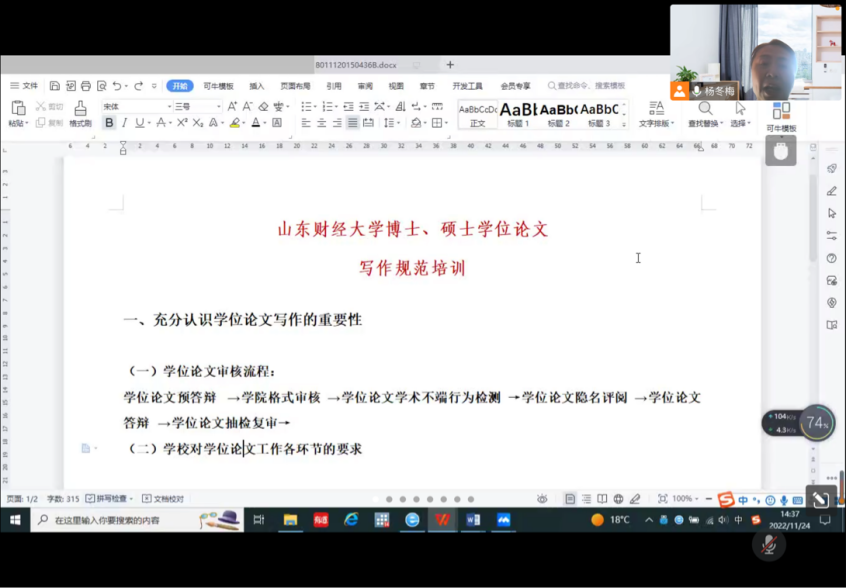 为规范论文格式,保证学位论文质量,11月24日下午,我院特别邀请博士生导师杨冬梅教授线上开展2023届毕业研究生学位论文写作规范培训工作,统计交叉科学研究中心主任兼统计与数学学院副院长田金方教授主持专题讲座,2023届全体毕业研究生参加本次培训会议。