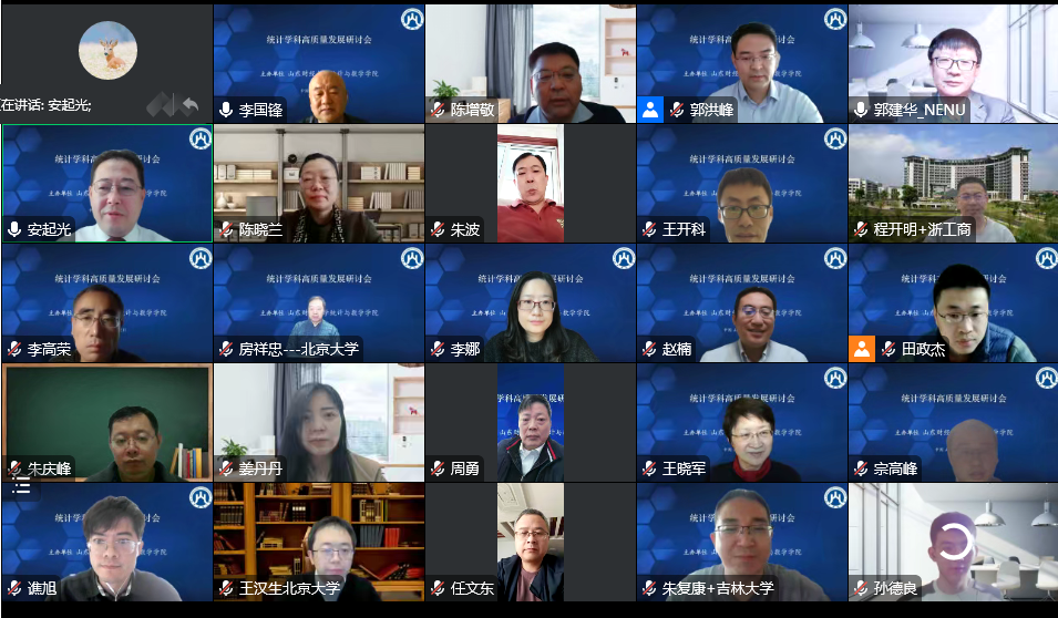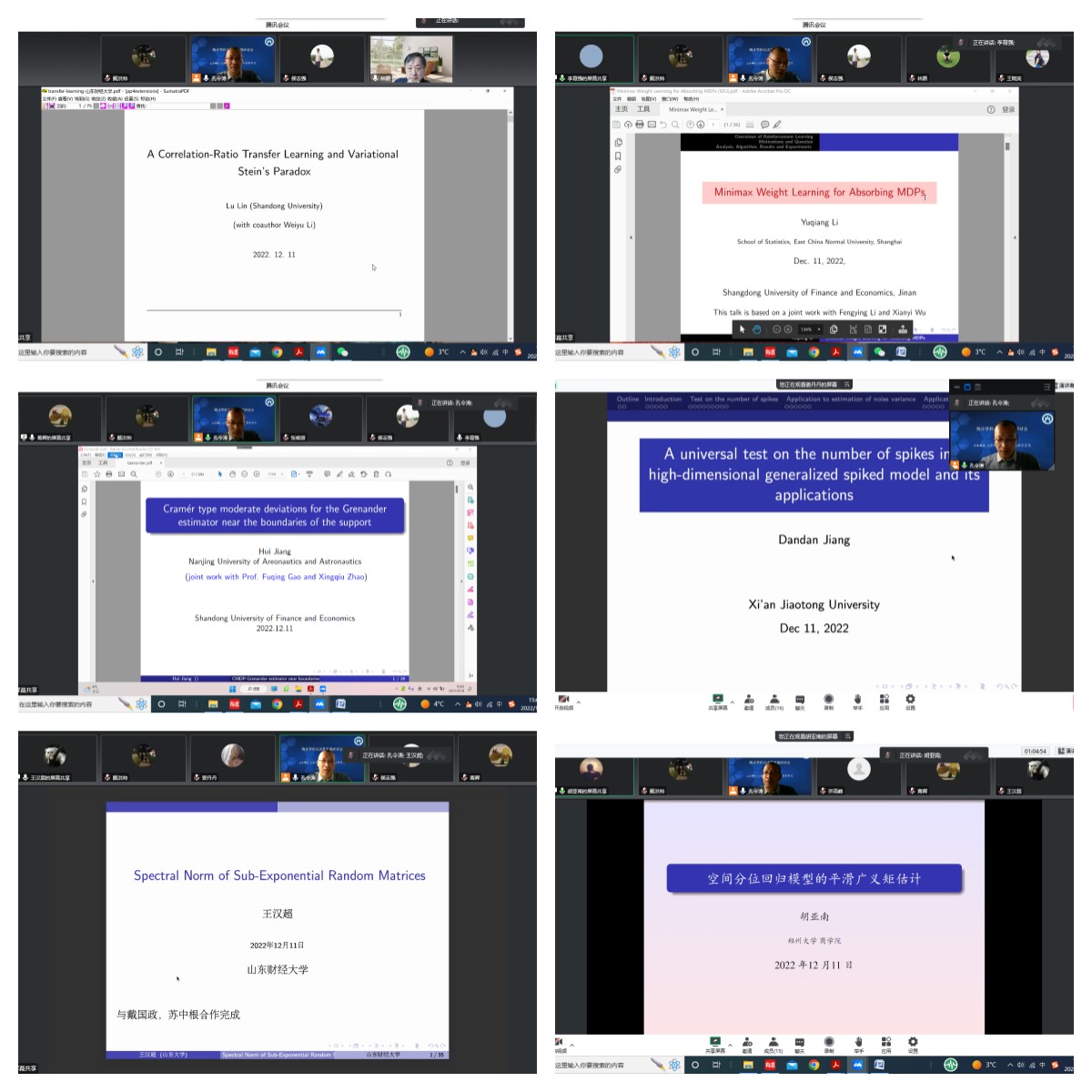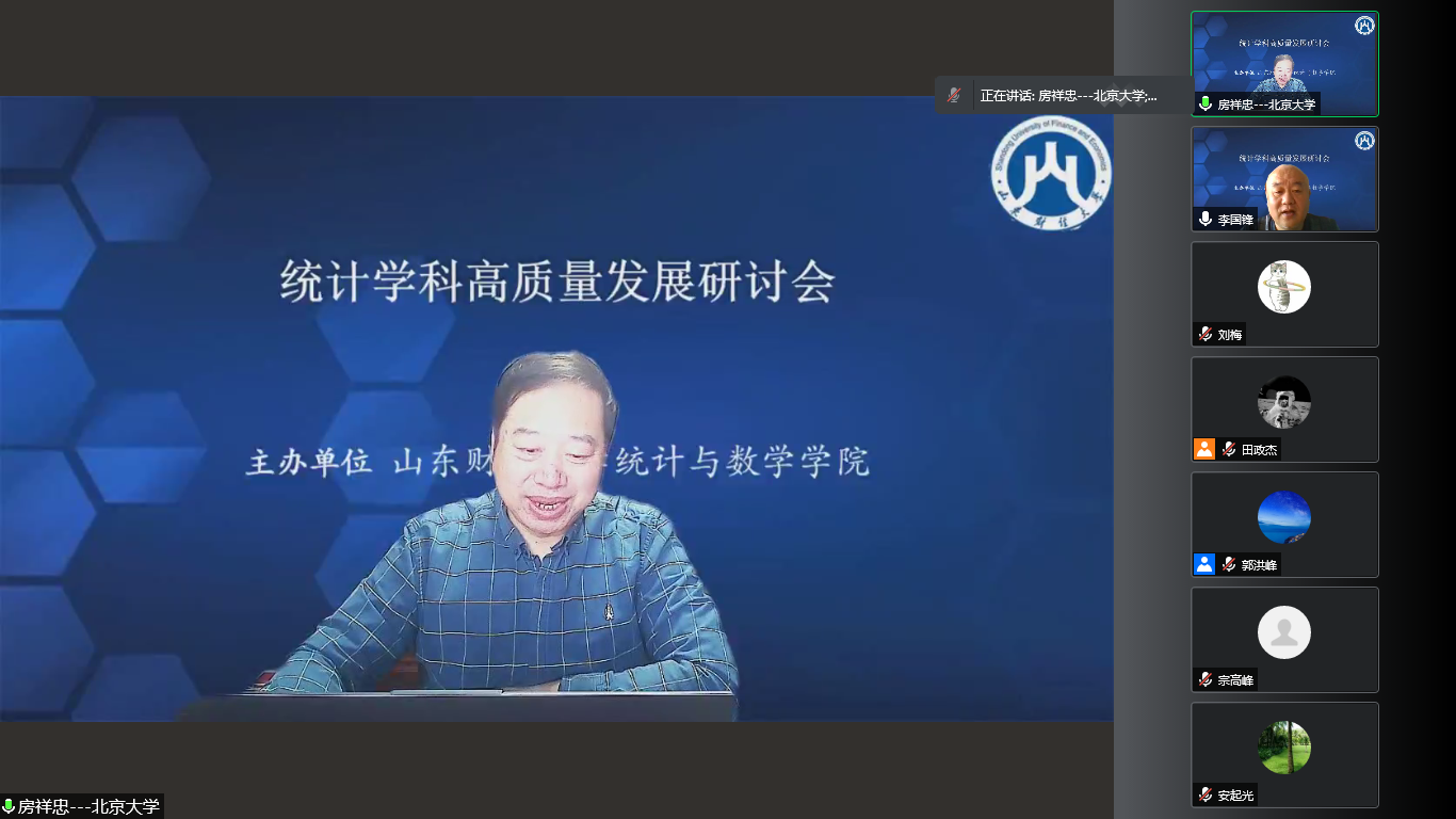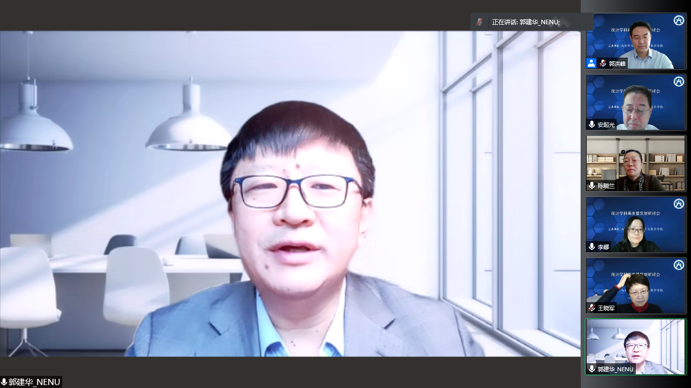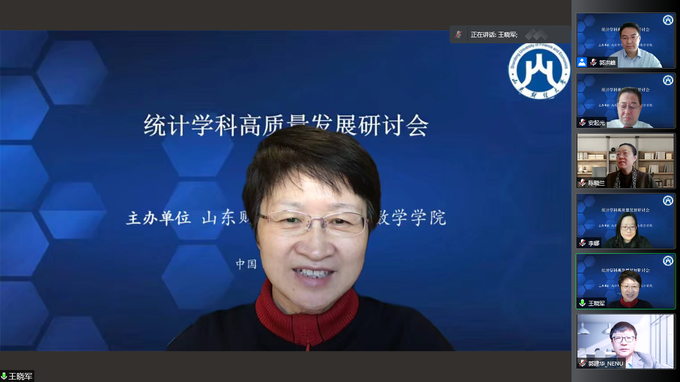 12月11日,山东财经大学统计与数学学院举办的“2022年统计学科高质量发展研讨会”以腾讯会议线上形式顺利举行。山东财经大学副校长陈晓兰教授,国务院学位委员会学科评议组成员,国家杰青,教育部“长江学者奖励计划”特聘教授,东北师范大学副校长、中国现场统计研究会理事长郭建华教授,全国应用统计专业学位研究生教育指导委员会秘书长、中国人民大学统计学院院长王晓军教授先后致辞。