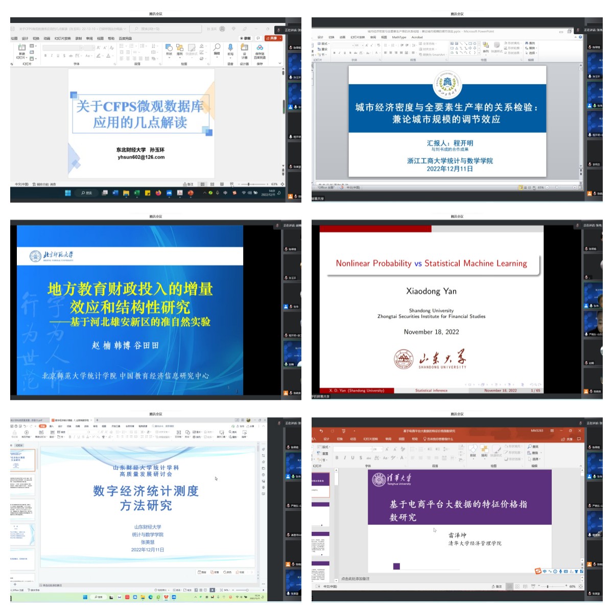 经济统计分组报告:东北财经大学统计学院教授、博士生导师、副院长,国家社科基金重大项目首席专家孙玉环《关于CFPS 微观数据库应用的几点解读》; 浙江工商大学统计 与数学学院教授、博士生导师,院长,国家社科基金重大项目首席专家程开明《城市经济密度与全要素生产率的关 系验:兼论城市规模的调节效应》;北京师范大学统计学院、教授、博士生导师副院长赵楠《地方教育财政投入的增量和结构性 研究——基于河北雄安新区的准自然实验》;山东大学金融研究院副研究员严晓东《非线性期望与统计机器学习》;山东财经大学统计与数学学院博士、预聘副教授张美慧《数字经济统计测度方法研究; 清华大学经济管理学院助理研究员雷泽坤《基于电商平台大数据的特征价格指数研究》。