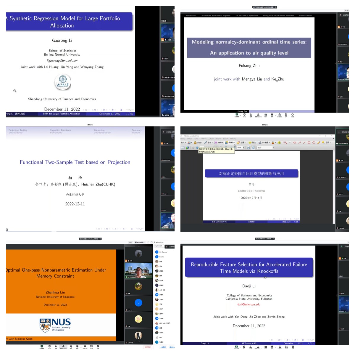 金融统计分组报告:加州州立大学助理教授李道纪《Reproducible Feature Selection forAccelerated Failure Time Models via Knockoffs》;新加坡国立大学教授林振华《Optimal One-pass Nonparametric Estimation Under Memory Constraint》;上海财经大学常任教授、博导,上海财经大学政府统计研究院执行院长黄涛《对称正定矩阵时间序列自回归模型的统计推断》;上海财经大学副教授(长聘)、博导柏杨《Functional Two Sample Test based on Projection》;吉林大学教授、博导,吉林国家应用数学中心副主任、概率统计与数据科学系主任朱复康《Modeling normalcy-dominant ordinal time series》;北京师范大学统计学院教授,博导李高荣《A Synthetic Regression Model for Large Portfolio Allocation》。
