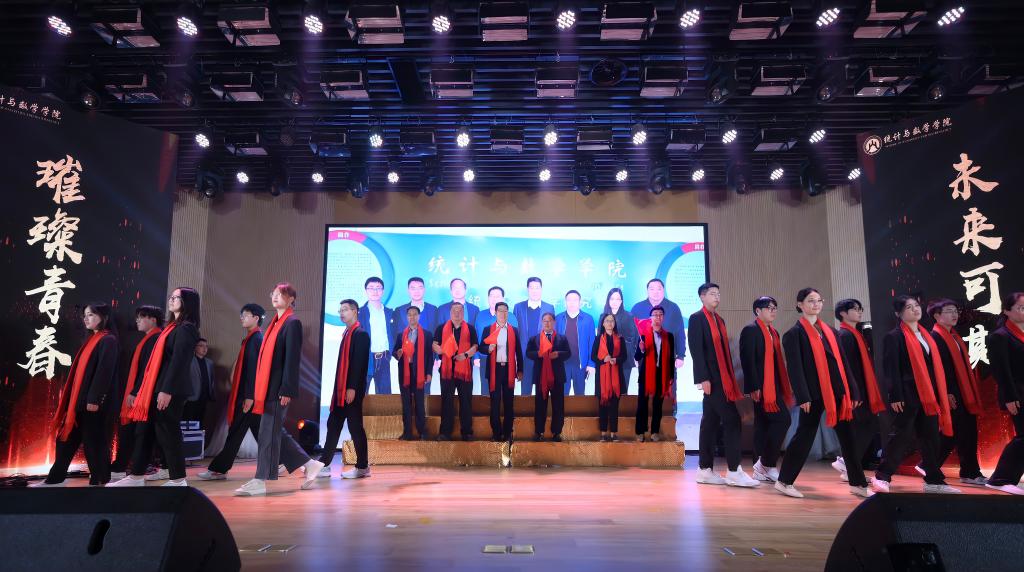 统计与数学学院院长安起光致开幕辞。晚会分为“岁月峥嵘”、“青春有我”、“未来可期”三个篇章,紧扣时代主旋律,热情讴歌新时代,节目内容丰富,涵盖歌曲、舞蹈、相声、民乐、走秀、合唱、朗诵等多种节目。现场气氛热烈,掌声喝彩不断。第一篇章——“岁月峥嵘”,演唱者歌声嘹亮,表演者积极投入,深深表达了对祖国大好河山与传统文化的热爱;第二篇章——“青春有我”,节目形式新颖,表演者用动人舞姿与优美旋律展现青春风采,诠释了我院学子不断前行的青春担当;第三篇章——“未来可期”,学子们声音整齐洪亮,铿锵有力,迸发出青年的朝气蓬勃与奋发向上。