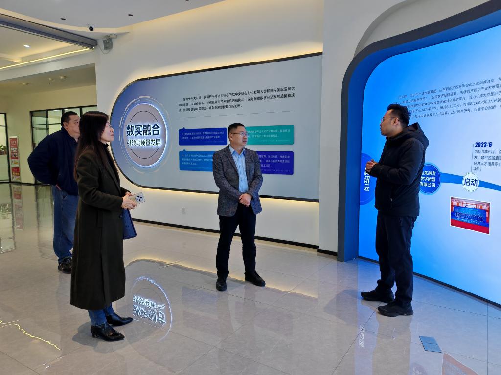 在山东融发数字运营有限公司董事长刘朋的陪同下,学院一行参观了企业数字技术展厅、实训室、多功能教室等。详细了解公司在数据运营、智慧城市及工业互联网等领域的前沿技术布局与创新应用成果以及对实习生的需求和培养计划。