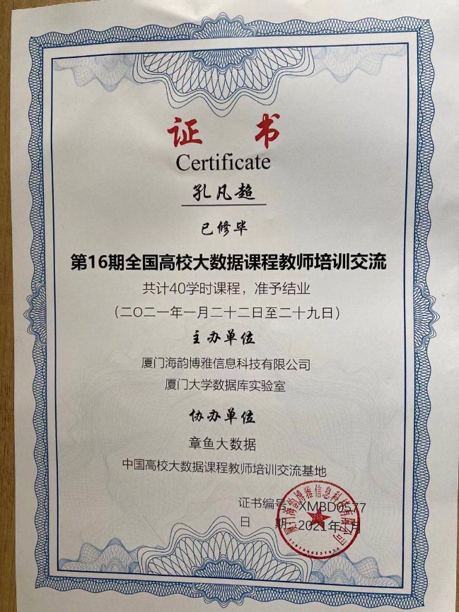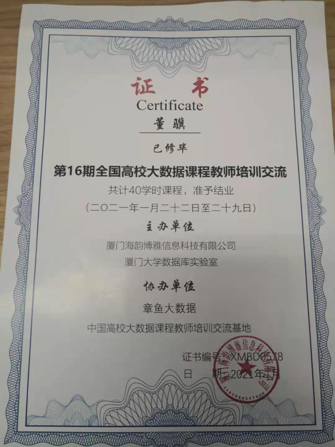 2021年1月22日至29日,由厦门海韵博雅信息科技有限公司联合章鱼大数据举办的“第16期全国高校大数据课程教师培训交流班(Hadoop+Spark综合班)”在厦门召开。本次培训交流班旨在为“加快中国高校大数据课程体系建设、促进中国高校大数据教学水平不断提升”做出积极贡献,邀请厦门大学云计算与大数据研究中心创始成员、高校大数据课程服务平台建设者、厦门大学计算机科学系副教授林子雨博士担任主讲教师。来自全国各大高等院校数据科学与大数据技术、计算机、软件工程等专业的科研、教学带头人,骨干教师参与了本次培训交流班。我院数据科学系青年教师孔凡超博士、董骥博士等参加了本次培训班。