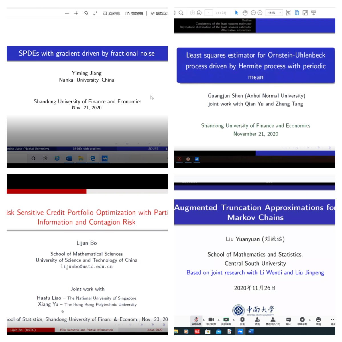 四位学者分别就分数噪声梯度驱动的SPDE、Hermit过程的参数估计、部分信息和传染风险下的风险敏感信贷组合优化以及马氏链平稳分布的截断近似等做了4场精彩报告。各位专家学者参与了系列活动,并与我院青年教师和研究生进行了交流。青年教师就学术研究和课题申报等问题与专家学者进行了咨询;研究生们就自己关心的兴趣选题、研究方法以及博士招考等问题,请教了向各位专家。