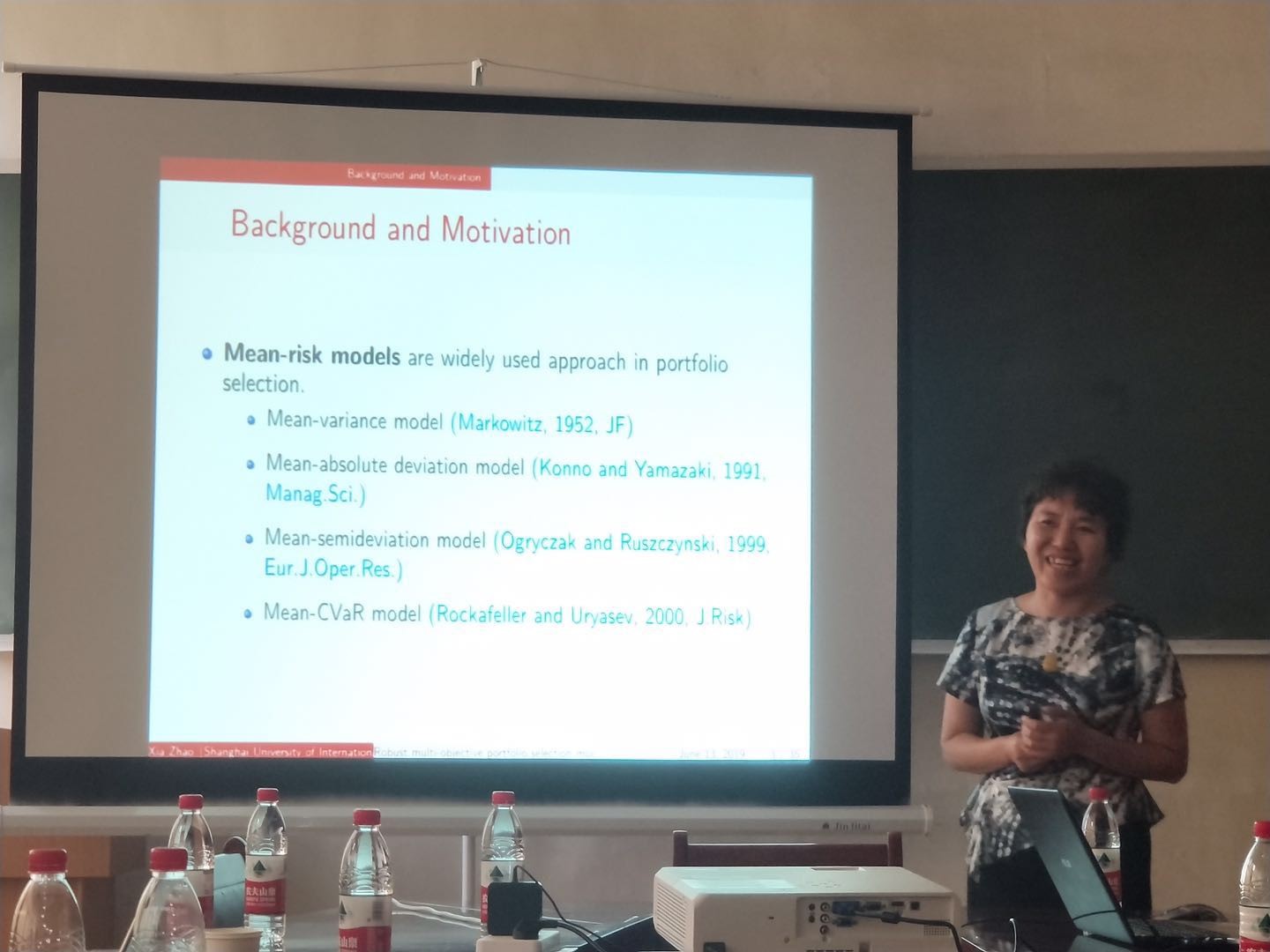 赵霞教授报告的题目为“Robust portfolio with multi-objective optimization model under high-dimensional scenarios”,赵教授结合保险市场与金融市场的实际问题,在高维情形下,基于均值-方差-CVAR准则对稳健投资组合的优化问题进行研讨。结合协方差矩阵的不同估计量、CVAR的计算方法和正则化方法,在允许卖空条件下构造了五个渐进优化问题。比较了不同方法对投资组合样本外效用的影响。