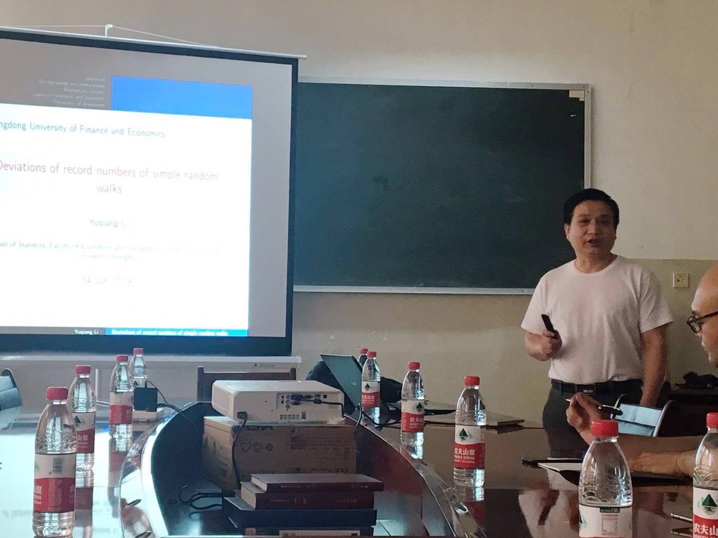 李育强副教授针对“Deviations on record numbers of simple random walks”问题进行了报告。该报告从最基本的随机游走过程着手,介绍了包括中偏差极限定理、小球渐近概率等一些与简单随机游走阶梯点个数相关的新成果。